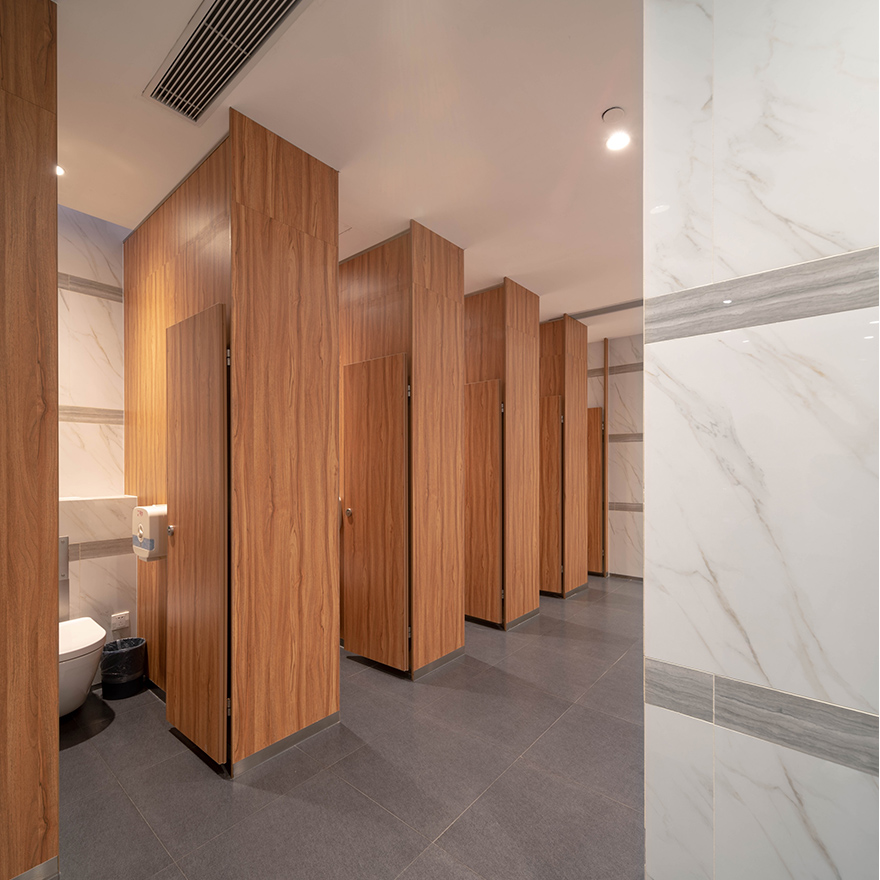 ການແບ່ງຫ້ອງນ້ໍາກະທັດລັດເປັນ laminate ອອກແບບສອງດ້ານຫນາ, ຄວາມກົດດັນສູງສ້າງຕັ້ງຂຶ້ນໂດຍ resin ພິເສດແລະຊັ້ນເຈ້ຍ kraft ຕ່າງໆໃນອຸນຫະພູມສູງແລະຄວາມກົດດັນສູງ, ມັນສາມາດຖືກນໍາໃຊ້ໂດຍກົງເປັນໂຄງສ້າງແລະບໍ່ຈໍາເປັນຕ້ອງນໍາໃຊ້ກັບ. substrate, ບໍ່ເຫມືອນກັບ HPL ແບບດັ້ງເດີມ. ເນື່ອງຈາກຄວາມຫນາແຫນ້ນແລະຄວາມຫລາກຫລາຍຂອງທາງເລືອກສີ, ໂຄງສ້າງ, ແລະການປິ່ນປົວດ້ານ, ມັນເຫມາະສົມທີ່ສຸດສໍາລັບການແກ້ໄຂພາຍໃນທີ່ຮັບຜິດຊອບ. ມັນຍັງຖືກນໍາໃຊ້ຢ່າງກວ້າງຂວາງສໍາລັບຝາໃນລົ່ມ, ຫ້ອງນ້ໍາ, ການແບ່ງປັນຫ້ອງ locker, ຊ່ອງຫວ່າງ, ຕູ້ເກັບຮັກສາແລະ ຫຼາກຫຼາຍຂອງ countertops.